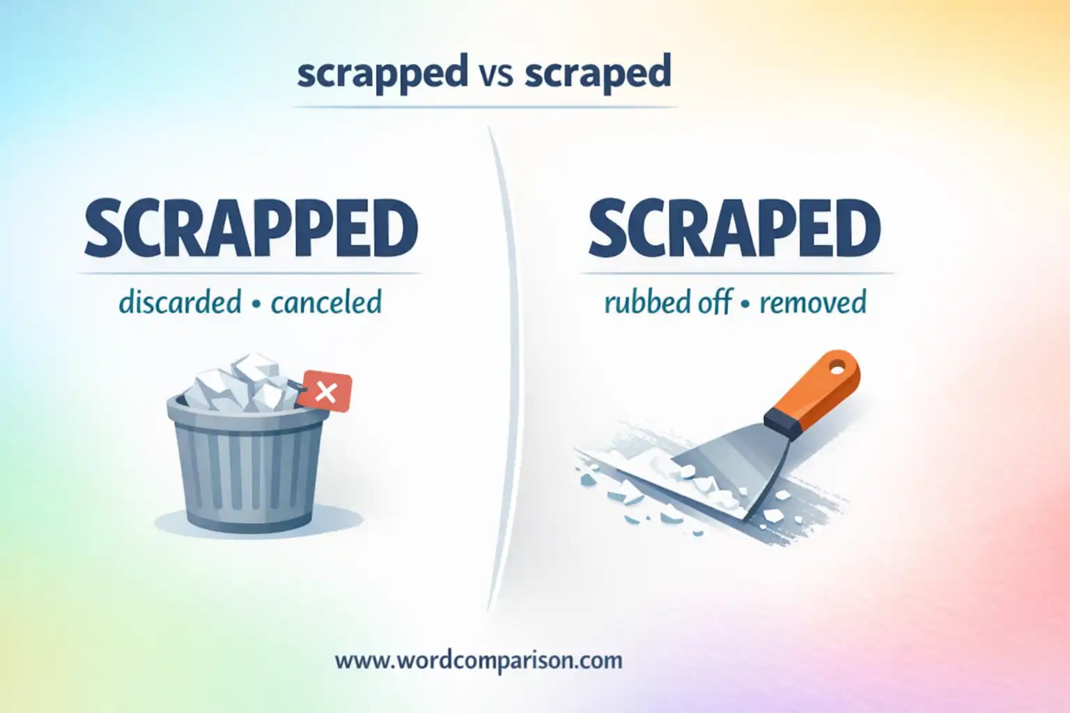 | Common Mistakes | “I scraped the project” (should be scrapped) | “I scrapped the paint” (should be scraped) |